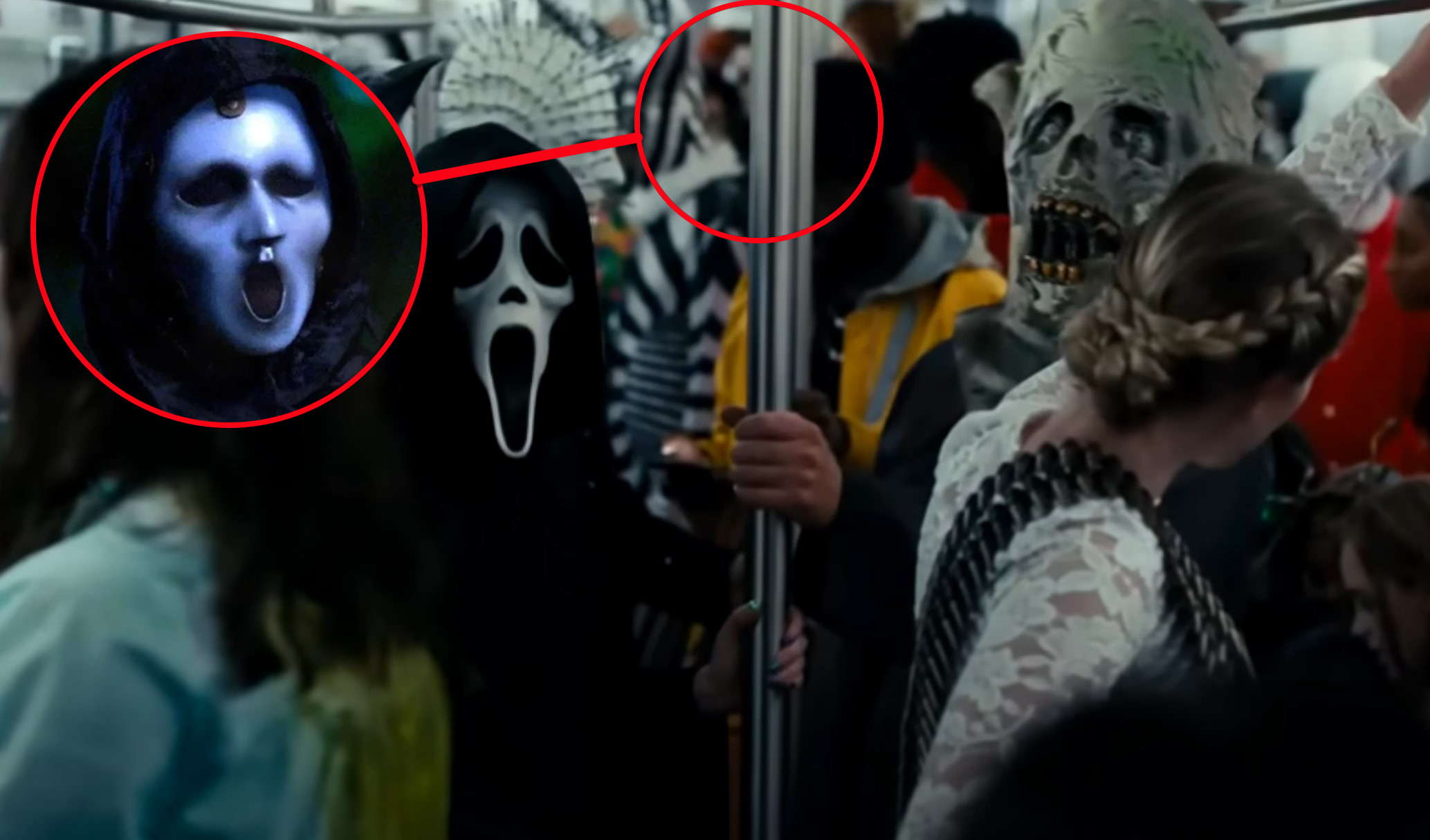 Yes, the mask makes a blink-and-you’ll-miss-it appearance on the train scene when the core characters are on a Halloween train full of familiar monsters and killers such as Pinhead, Freddy Kruger, Jason Vorhees and… Ghostface MkII.