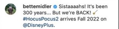 Bette Midler, Sarah Jessica Parker and Kathy Najimi have all now confirmed on Social media that the will return as Winifred, Sarah and Mary Sanderson for the highly anticipated Disney+ sequel next year.