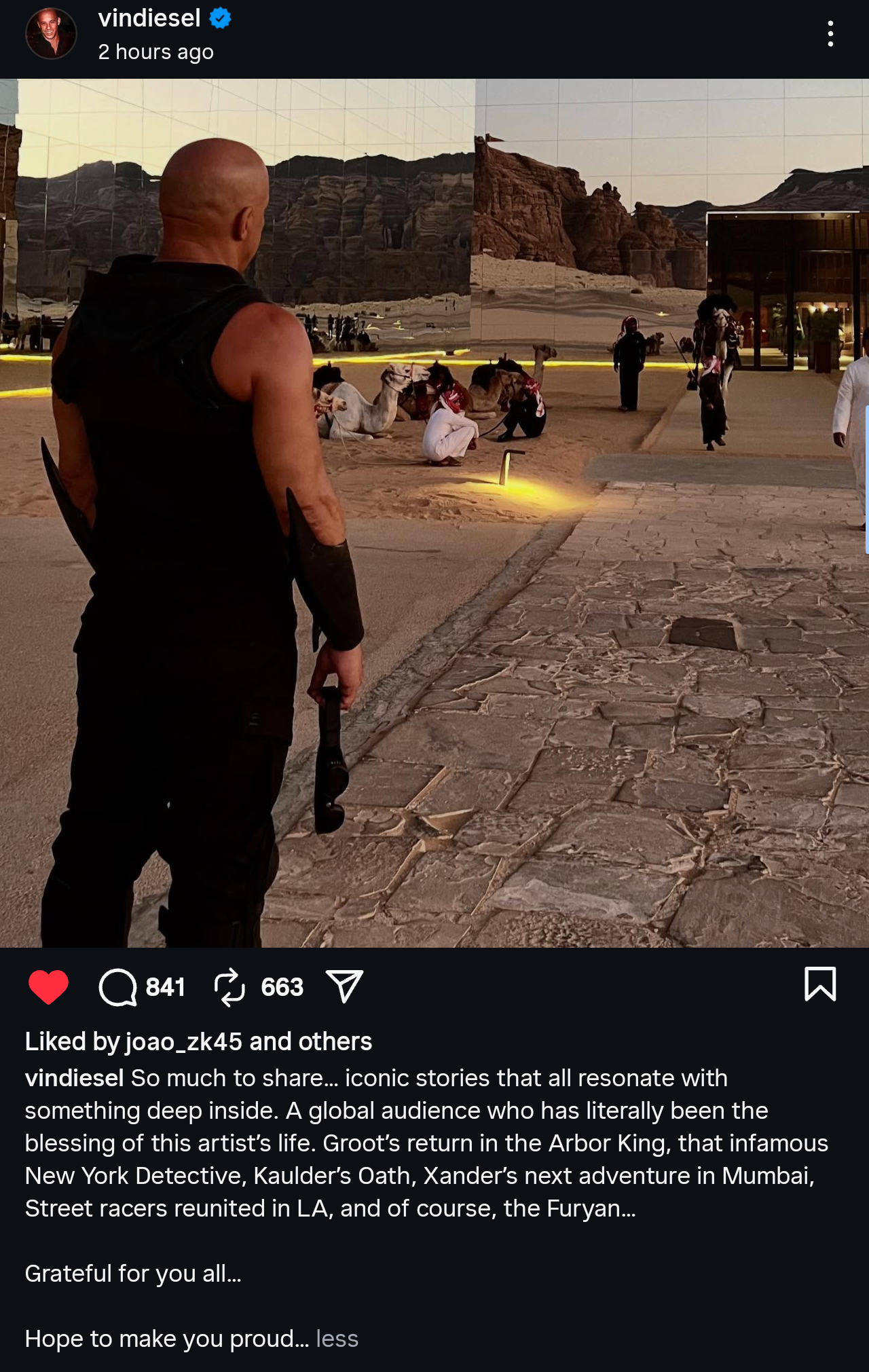Diesel also posted a second image, below, of him wearing this outfit and this time he seems to be on set where they’re using The Volume, the massive screens that serve as digital and interactive backgrounds rather than using greenscreen or matte paintings, it’s the same tech that was pioneered with The Mandalorian TV series.