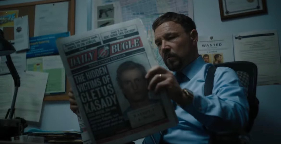 Interestingly, fans have noticed that in the movie someone can be seen reading The Daily Bugle newspaper, left, which has the Bugle logo from the Raimi Spider-man movies – although those movies had their own version of Venom.