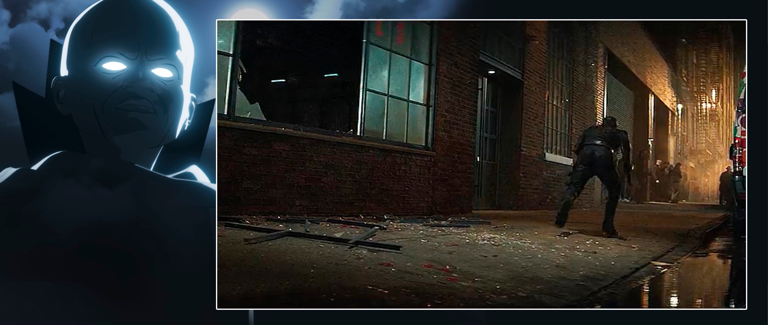 In the scene, Daredevil (Charlie Cox) pulls Bullseye (Wilson Bethel) through a window after an assassination attempt at Kingpin’s (Vincent D’Onofrio) boxing match, and as Daredevil runs away, the broken window and lights on the ceiling look a lot like The Watcher.