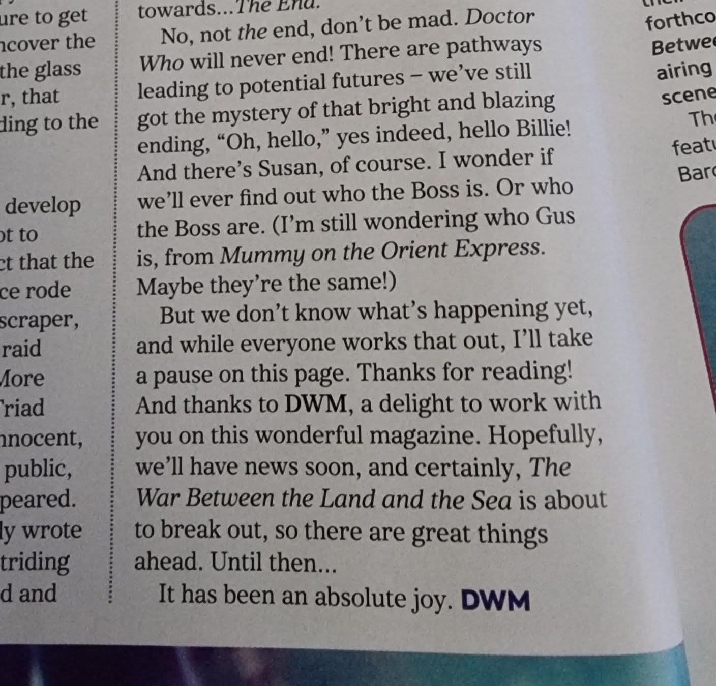 In the middle of all this happening, current showrunner Russell T Davies, who was writing a column in Doctor Who Magazine, suddenly announced that he was signing of, writing: ‘We don’t know what’s happening yet and while everyone works that out, I’ll take a pause on this page. Thanks for reading!’